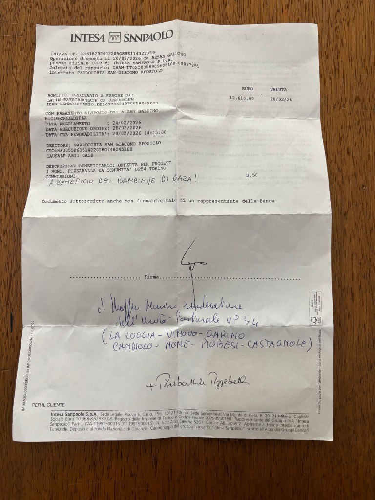 Per noi di Candiolo è possibile fare anche un bonifico sul conto della Parrocchia, precisando la causale: “per i bambini di Gaza“. Il bonifico va fatto entro il 31 gennaio 2026 sull’IBAN: