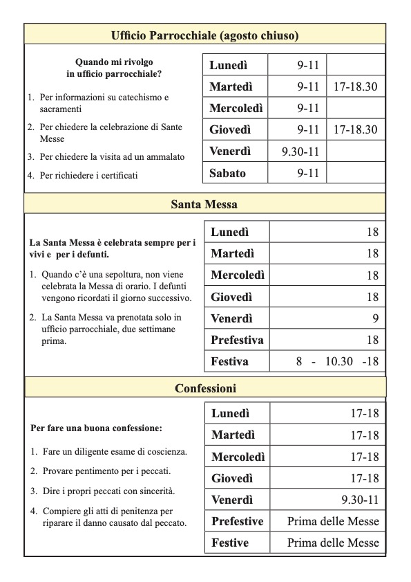 UFFICIO PARROCCHIALE Quando mi rivolgo all’ufficio parrocchiale? per informazioni su catechismo e sacramenti per chiedere la celebrazione di Sante messe per chiedere la visita ad un ammalato per richiedere i certificati Condividi: Fai clic per condividere su Facebook (Si apre in una nuova finestra) Facebook Fai clic per condividere su WhatsApp (Si apre in una nuova finestra) WhatsApp Fai clic per condividere su Telegram (Si apre in una nuova finestra) Telegram